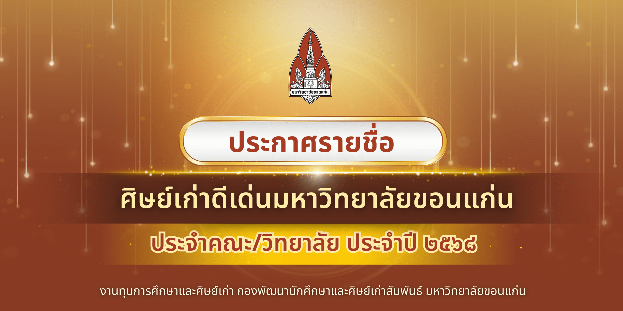 ประกาศผลคัดเลือกศิษย์เก่าดีเด่น มหาวิทยาลัยขอนแก่น ประจำคณะ/วิทยาลัย ประจำปี ๒๕๖๘ มหาวิทยาลัยขอนแก่น ขอประกาศเกียรติคุณและร่วมแสดงความยินดีกับศิษย์เก่าผู้ได้รับการคัดเลือกให้เป็น “ศิษย์เก่าดีเด่