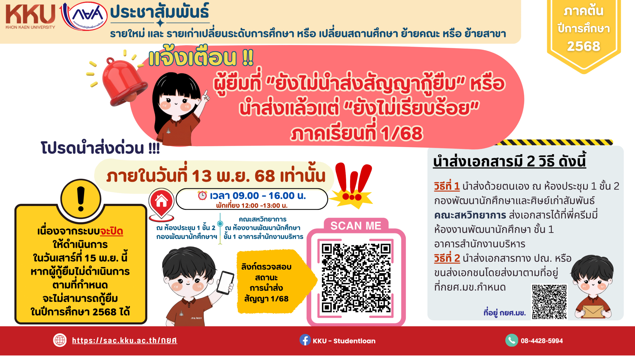 แจ้งเตือนผู้กู้ยืมรายใหม่ มข. นำส่งสัญญากู้ยืม ภาคเรียนที่ 1/68 ด่วน (ระบบปิด 15 พ.ย.68 นี้)