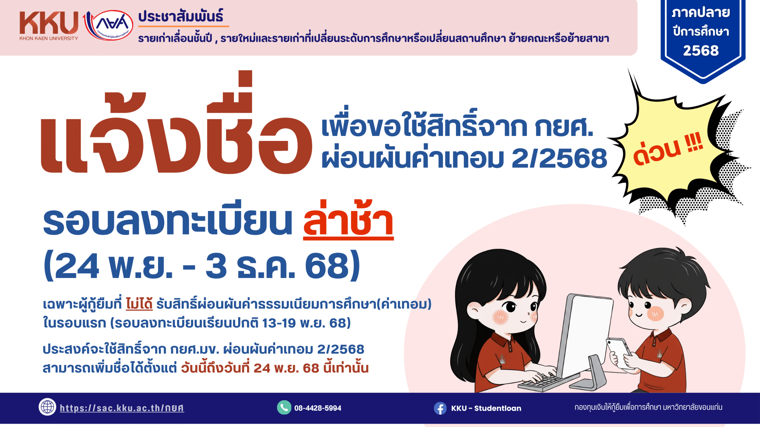 ด่วน! เพิ่มชื่อใช้สิทธิ์ผ่อนผันค่าเทอม กยศ. รอบลงทะเบียนล่าช้า 2/2568 (24 พ.ย.- 3 ธ.ค.68)