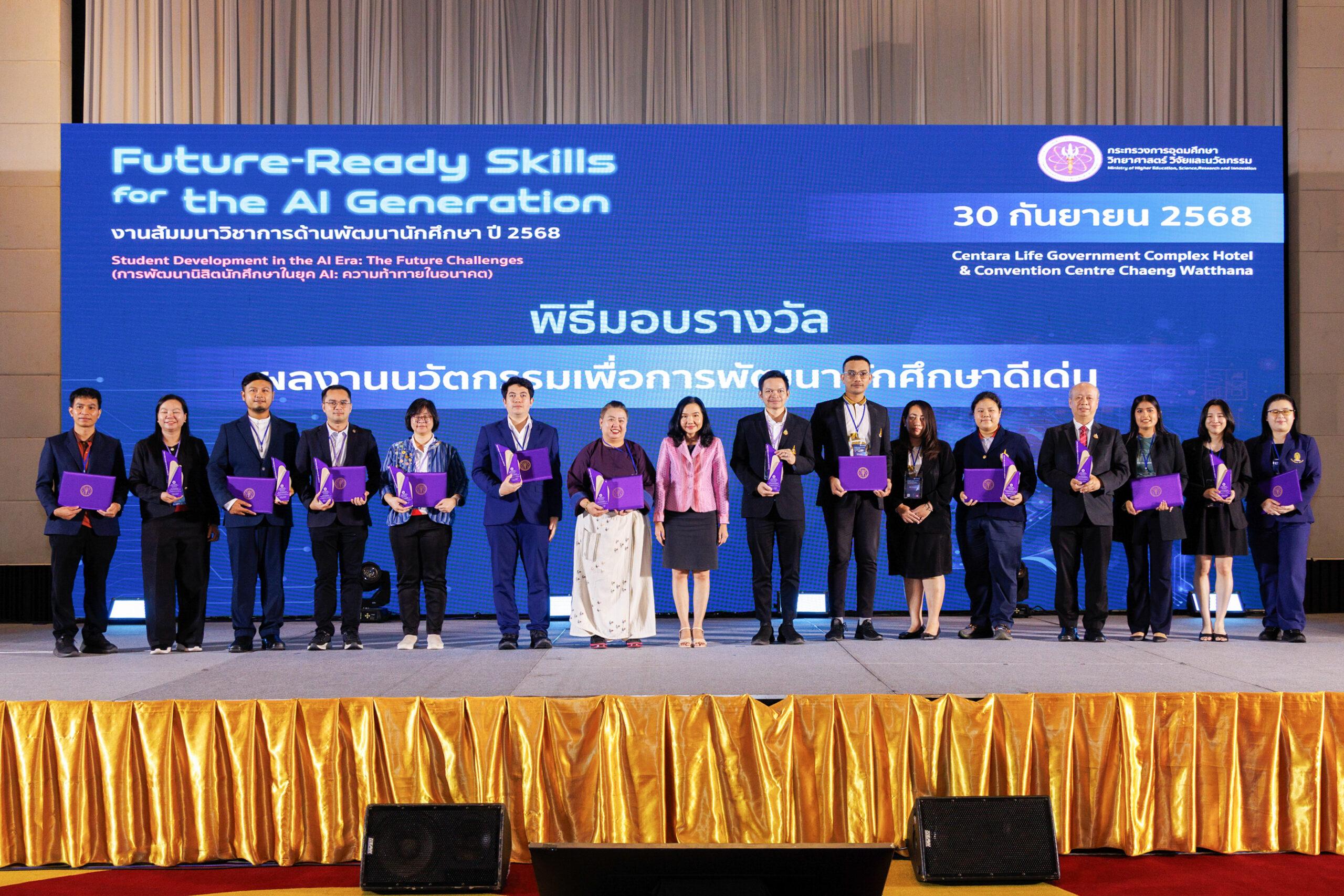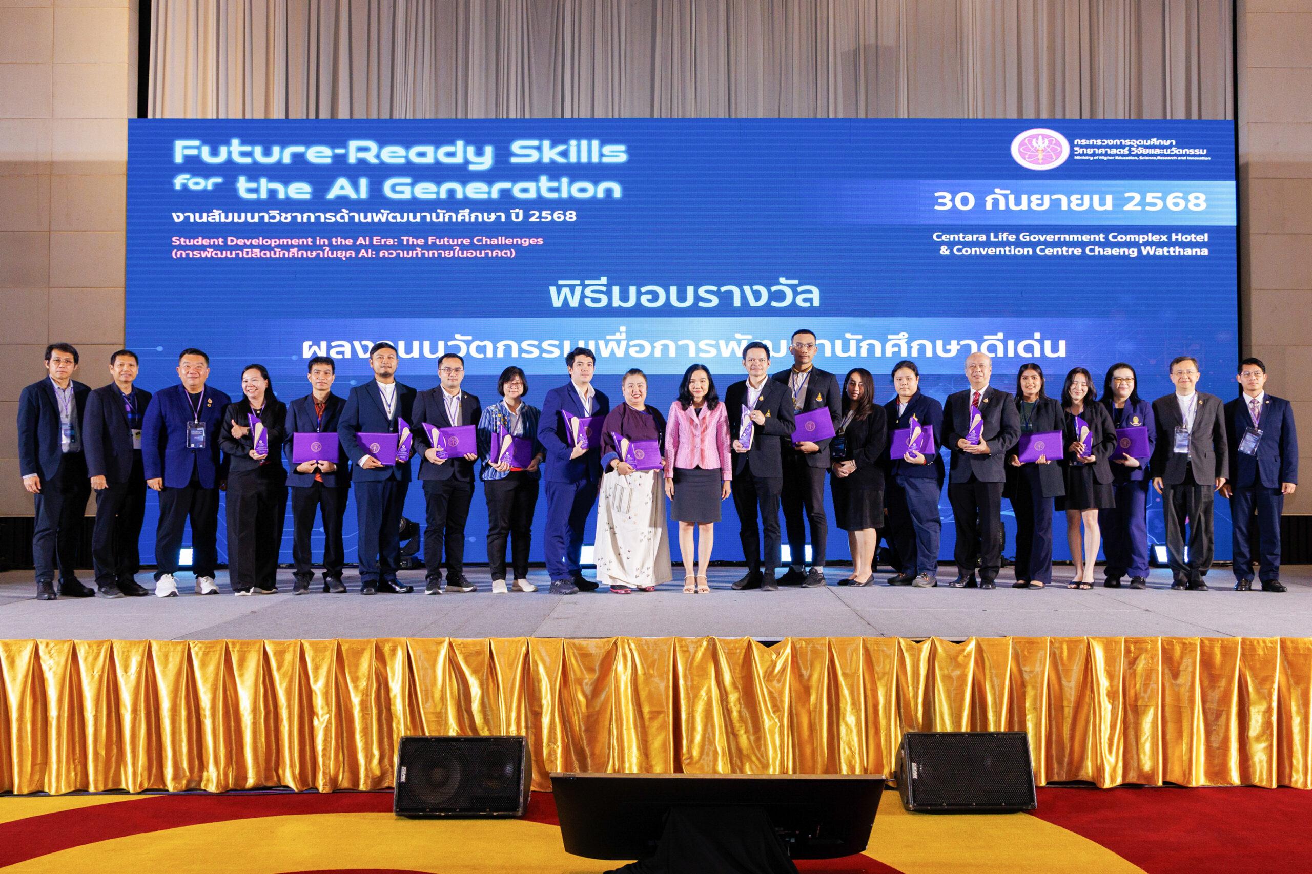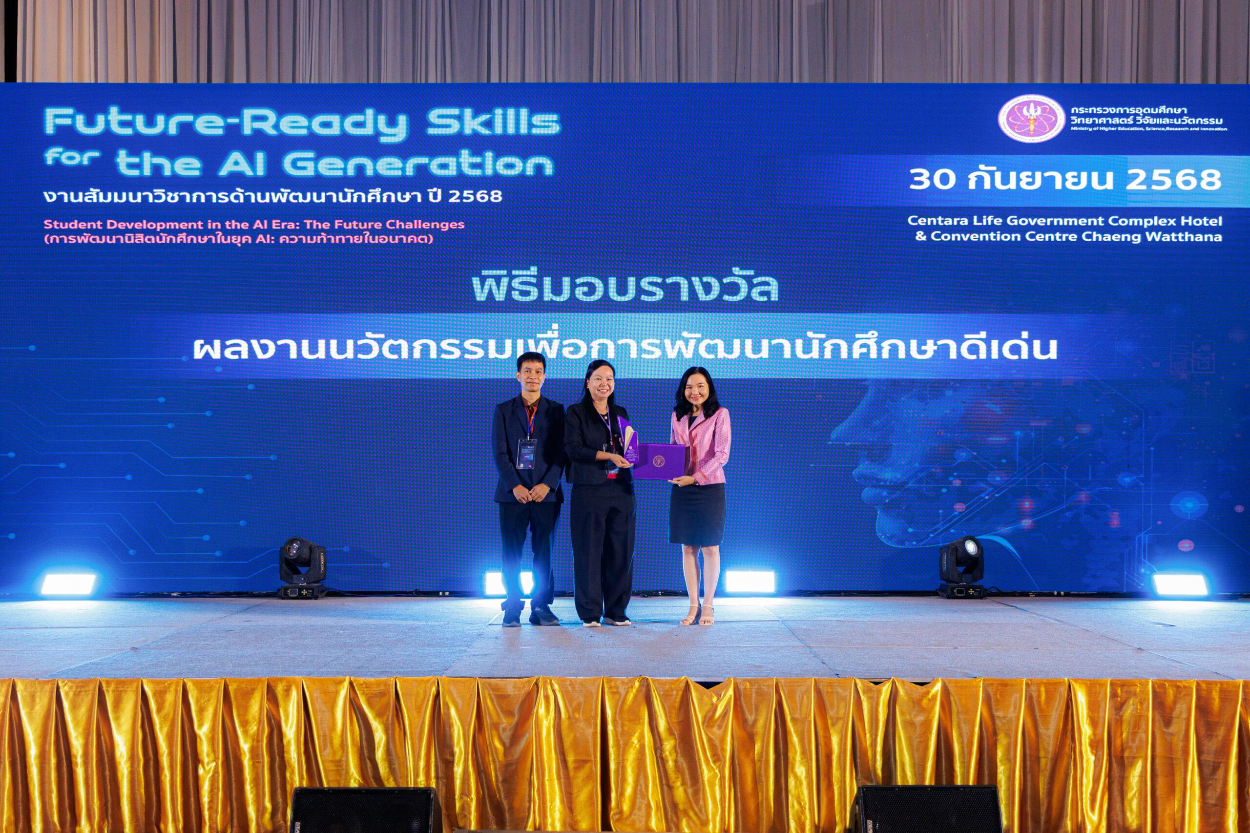 เมื่อวันที่ 29-30 กันยายน 2568 ณ โรงแรมเซ็นทารา ไลฟ์ กรุงเทพมหานคร ในงานสัมมนาวิชาการด้านพัฒนานักศึกษา ประจำปี 2568 ภายใต้หัวข้อ “การพัฒนานิสิตนักศึกษาในยุค AI: ความท้าทายในอนาคต” ซึ่งจัดโดยกระทรวงการอุดมศึกษา วิทยาศาสตร์ วิจัยและนวัตกรรม (อว.) กองพัฒนานักศึกษาและศิษย์เก่าสัมพันธ์ มหาวิทยาลัยขอนแก่น ได้รับการประกาศเกียรติคุณให้เป็น 1 ใน 10 ผลงานที่ได้รับรางวัล “ผลงานนวัตกรรมเพื่อการพัฒนานักศึกษาดีเด่น” พร้อมนำเสนอผลงานโดย นางเจษฎาพร ศรีรัตนประพันธ์ รักษาการแทนผู้อำนวยการกองพัฒนานักศึกษาและศิษย์เก่าสัมพันธ์ และ นายปรีดี ศรีตระกูล นักประชาสัมพันธ์ชำนาญการ