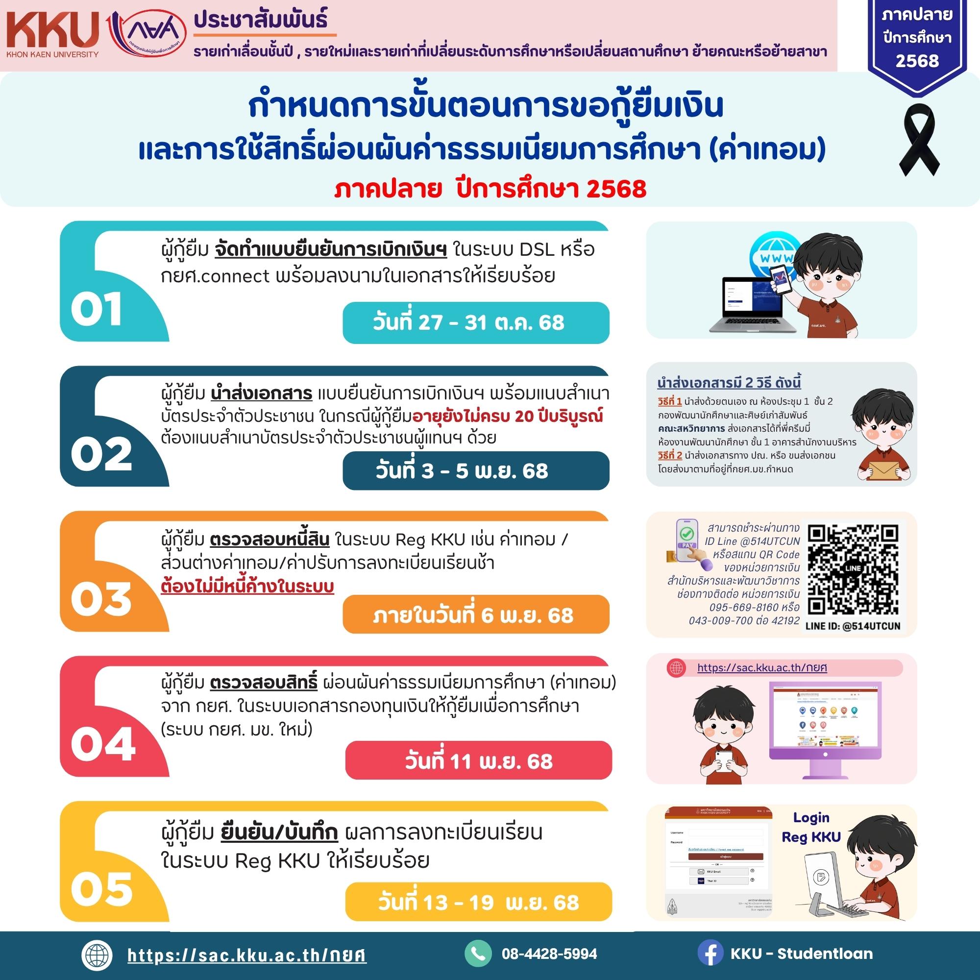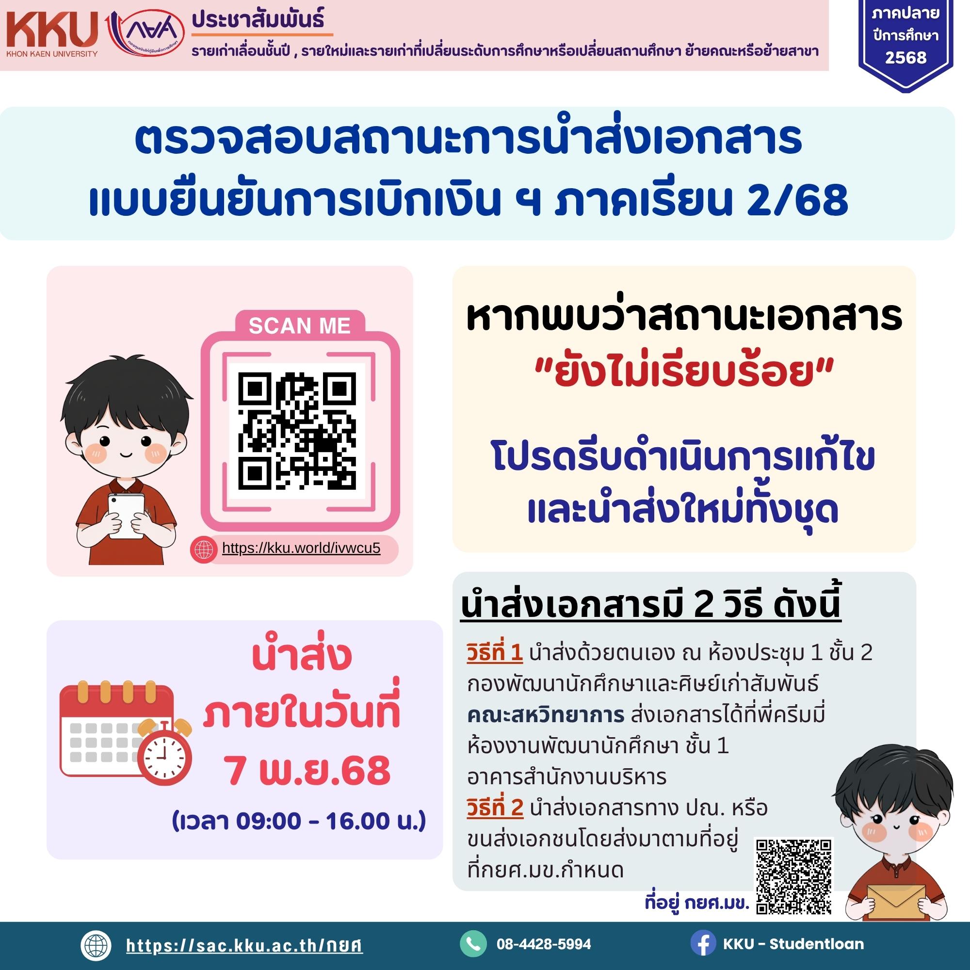 สำหรับผู้กู้ยืมที่นำส่งเอกสารแบบยืนยันการเบิกเงินฯ ภาคเรียนที่ 2/2568  เรียบร้อยแล้ว โปรดตรวจสอบสถานะการนำส่งเอกสาร หากพบว่าเอกสาร “ยังไม่เรียบร้อย”   ให้รีบดำเนินการแก้ไขเอกสารและนำส่งเอกสารใหม่ทั้งชุด ภายในวันที่ 7 พ.ย. 2568 นี้