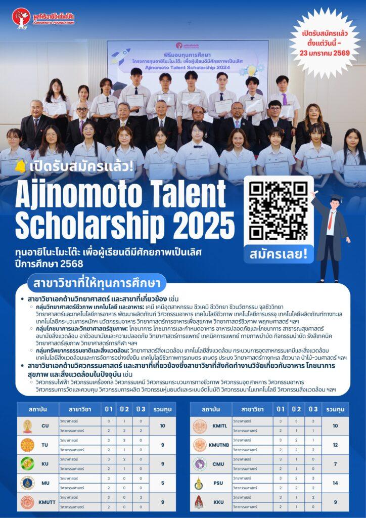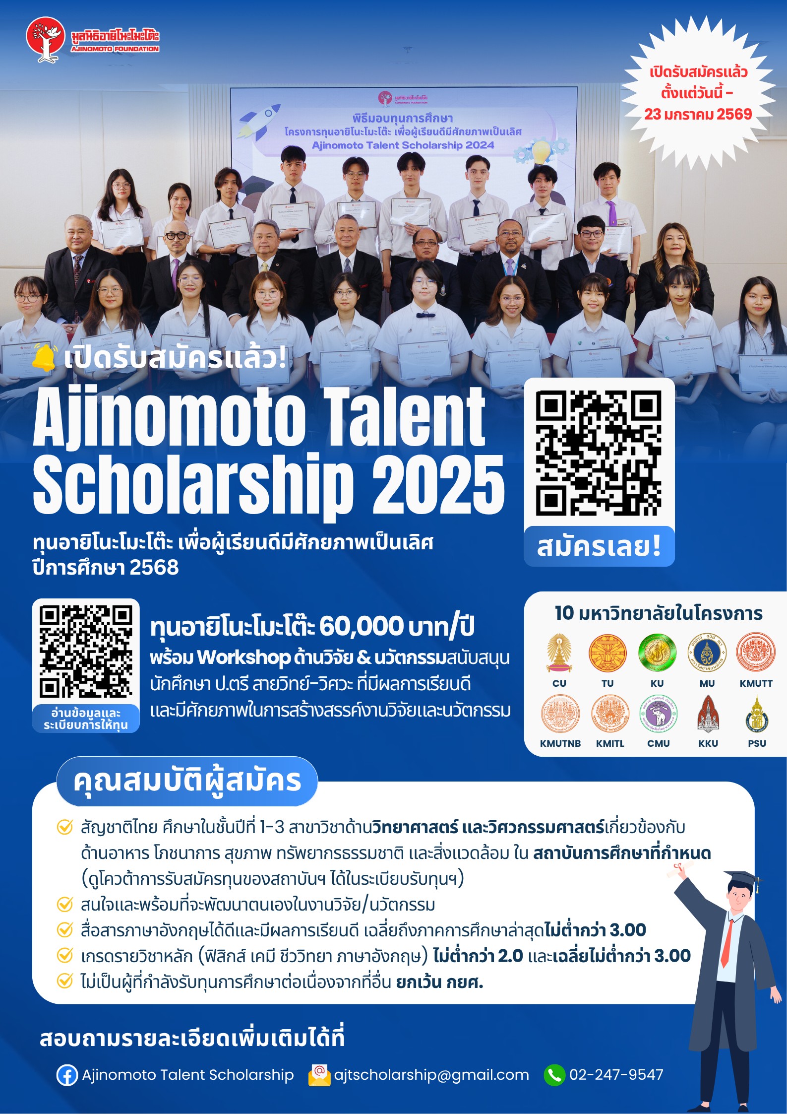 ด้วยมูลนิธิอายิโนะโมะโต๊ะประสงค์มอบทุนการศึกษาโครงการ “ทุนมูลนิธิอายิโนะโมะโต๊ะ เพื่อผู้เรียนดี มีศักยภาพเป็นเลิศ” ประจำปีการศึกษา 2568 มูลค่าทุนละ 60,000 บาท (หกหมื่นบาทถ้วน) ต่อเนื่องจนจบการศึกษาหลักสูตร 4 ปี แก่มหาวิทยาลัยขอนแก่น จำนวน 9 ทุน ในสาขาวิชาเอกด้านวิทยาศาสตร์ วิศวกรรมศาสตร์ ที่เกี่ยวข้องกับด้านอาหาร โภชนาการ สุขภาพ ทรัพยากรธรรมชาติ และสิ่งแวดล้อม และผู้มีผลการเรียนดีเด่น ที่มีความสนใจ และมีศักยภาพที่จะสร้างสรรค์งานวิจัยและนวัตกรรมโดยมีคุณสมบัติ ดังต่อไปนี้