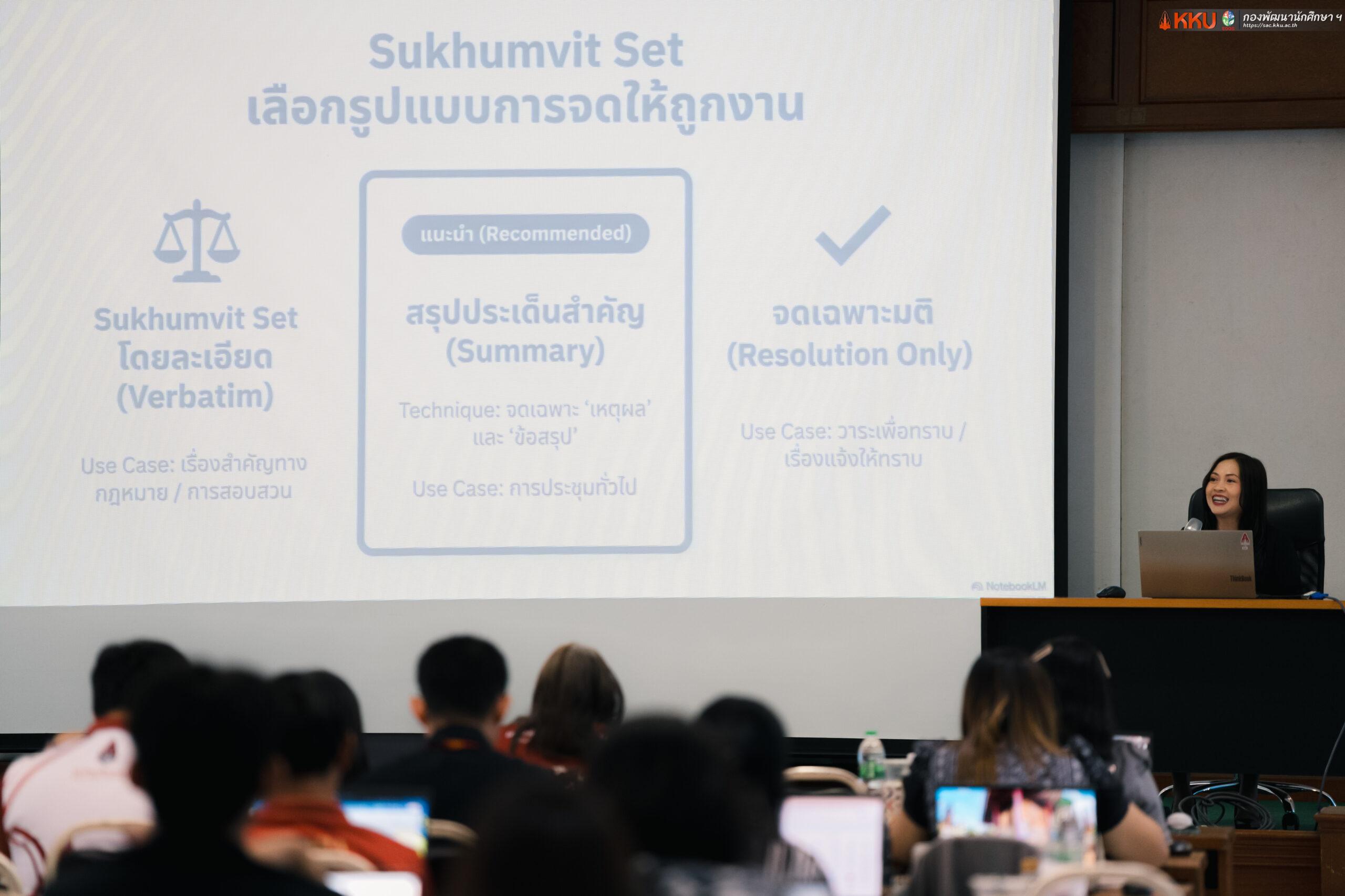 จากนั้นในช่วงที่สอง เป็นการบรรยายในหัวข้อ “เทคนิคการเขียนรายงานการประชุมอย่างมีประสิทธิภาพ” โดย นางสาววรินทร ภาคภูมิ นักวิชาการศึกษาชำนาญการ ซึ่งได้ให้ความรู้เกี่ยวกับรูปแบบและองค์ประกอบที่สำคัญของการจดบันทึกและการเขียนรายงานการประชุม เพื่อให้สามารถสื่อสารมติของที่ประชุมได้อย่างชัดเจนและครบถ้วน