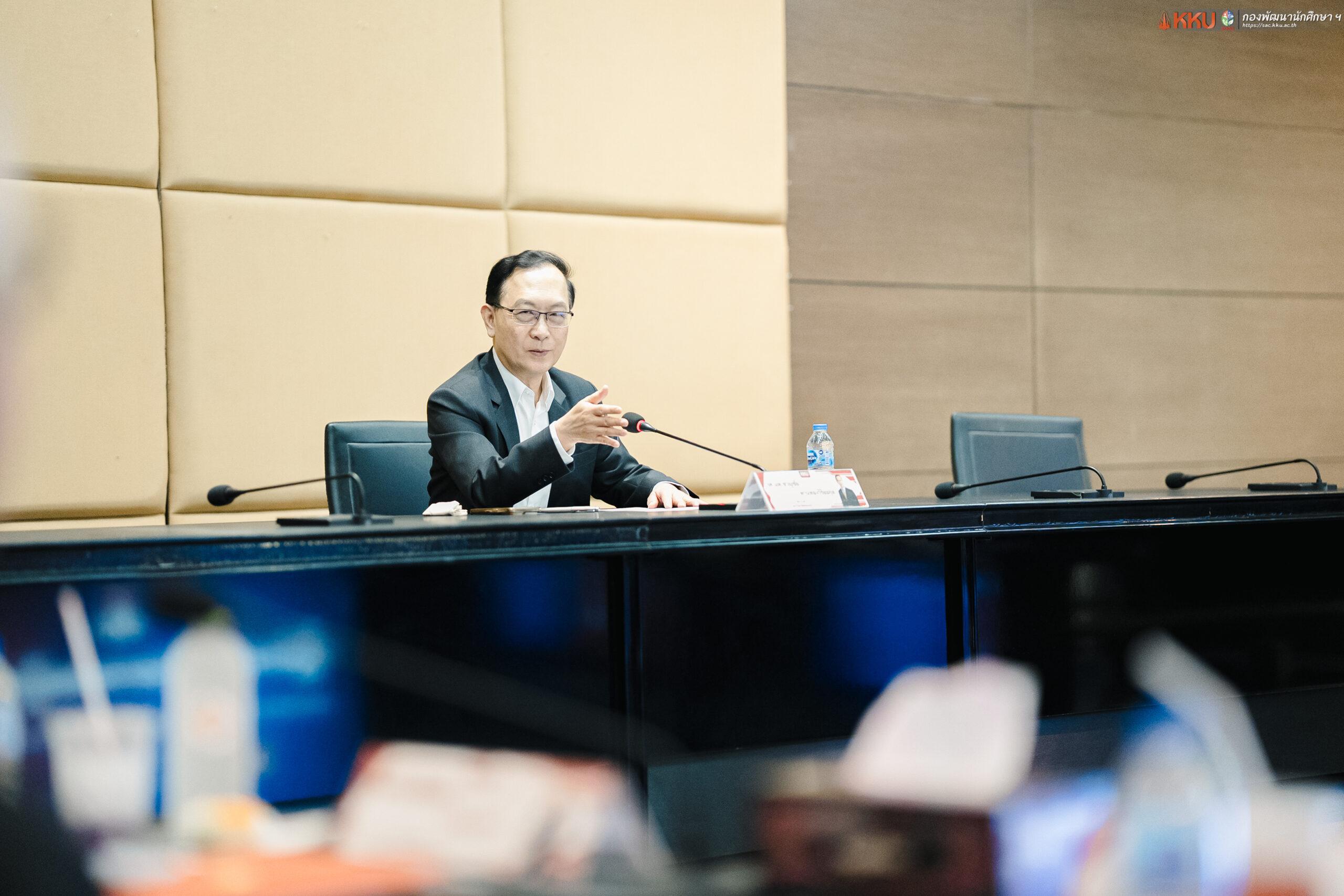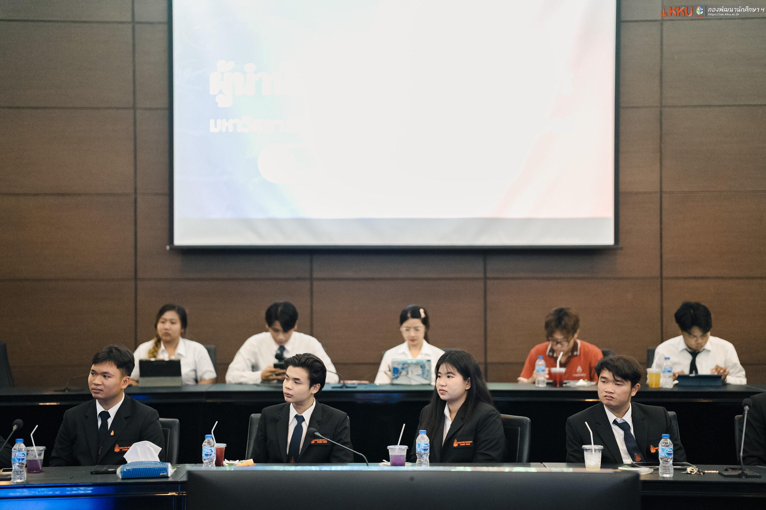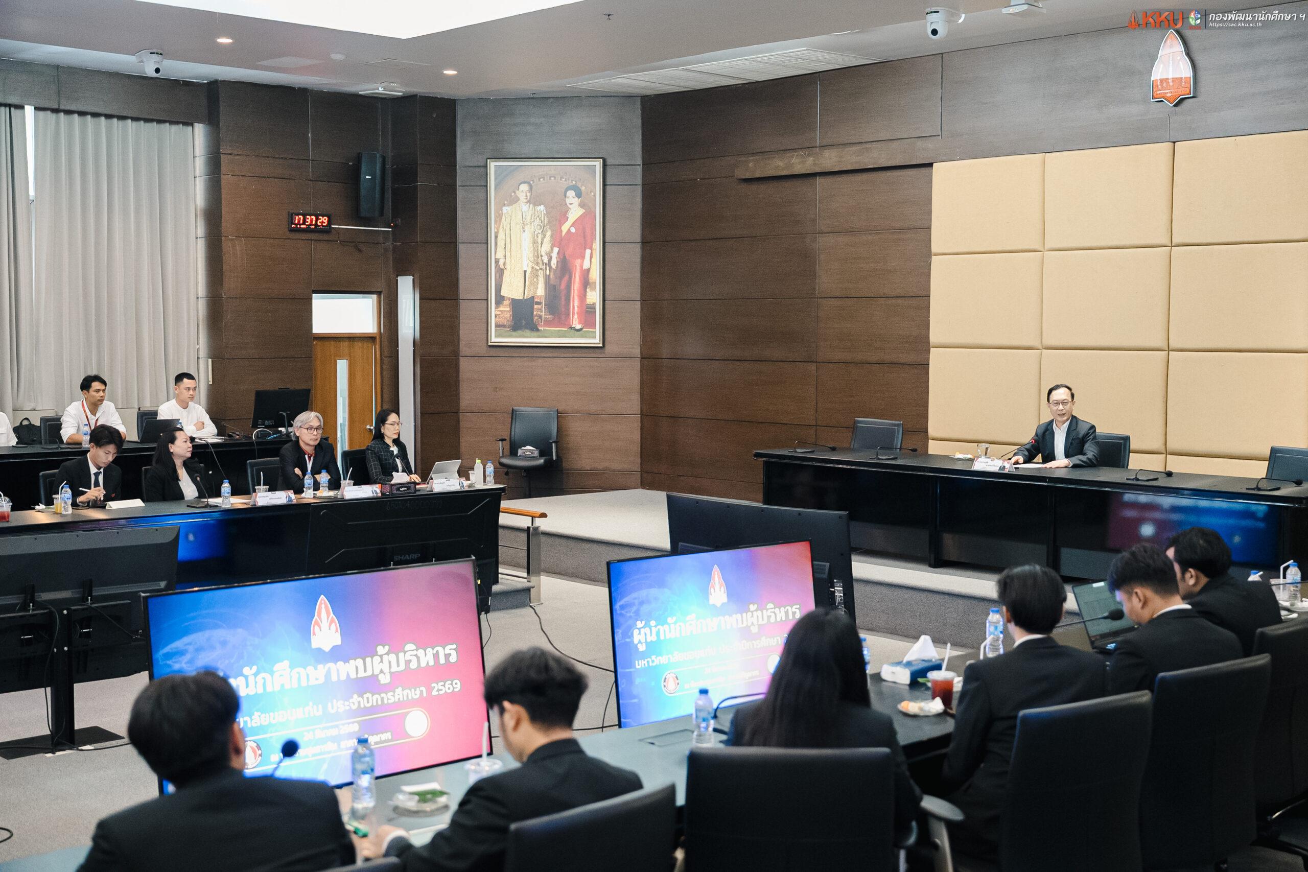 เมื่อวันอังคารที่ 24 มีนาคม 2569 ณ ห้องประชุมสารสิน ชั้น 2 อาคารสิริคุณากร มหาวิทยาลัยขอนแก่น กองพัฒนานักศึกษาและศิษย์เก่าสัมพันธ์ ได้จัดกิจกรรม “ผู้นำนักศึกษาพบผู้บริหาร มหาวิทยาลัยขอนแก่น” โดยได้รับเกียรติจาก รศ.นพ.ชาญชัย พานทองวิริยะกุล อธิการบดีมหาวิทยาลัยขอนแก่น เป็นประธานในพิธี พร้อมด้วย รศ.ดร.เพ็ญศรี เจริญวานิช รองอธิการบดีฝ่ายกิจการนักศึกษาและนวัตวณิชย์, รศ.น.สพ.ดร.ประพันธ์ศักดิ์ ฉวีราช ผู้ช่วยอธิการบดีฝ่ายกิจการนักศึกษาและนวัตวณิชย์ และบุคลากร ผู้นำนักศึกษาชุดใหม่ ประจำปีการศึกษา 2569 เข้าร่วมกิจกรรมอย่างพร้อมเพรียง