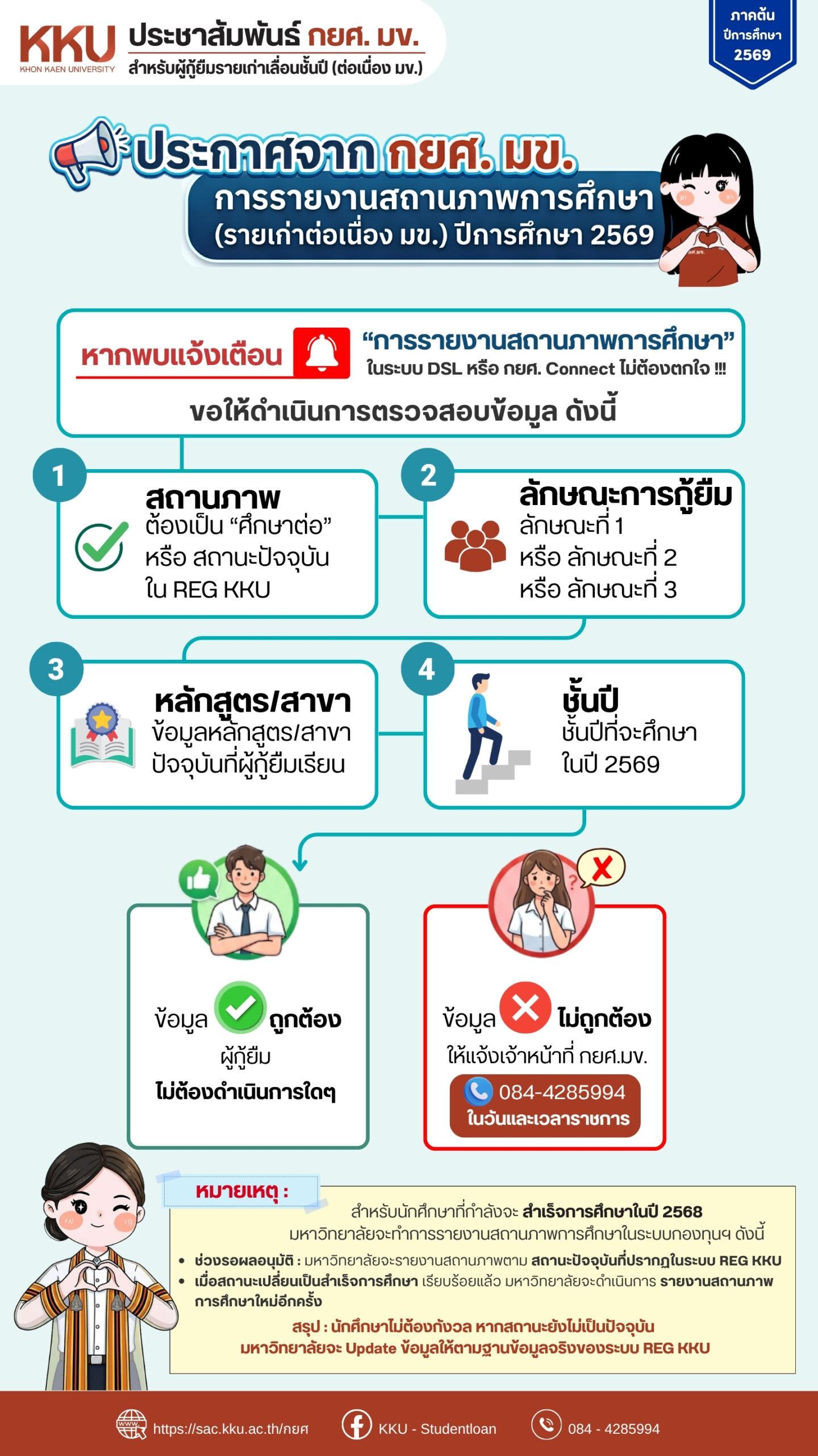 กองทุนเงินให้กู้ยืมเพื่อการศึกษา มหาวิทยาลัยขอนแก่น (กยศ. มข.) ขอแจ้งให้นักศึกษาผู้กู้ยืมรายเก่าเลื่อนชั้นปี (ต่อเนื่อง มข.) ทราบว่า หากนักศึกษาพบข้อความแจ้งเตือน “การรายงานสถานภาพการศึกษา” ในระบบ DSL หรือแอปพลิเคชัน กยศ. Connect ขอให้นักศึกษาไม่ต้องตกใจ เนื่องจากเป็นขั้นตอนการเตรียมความพร้อมสำหรับการกู้ยืมในภาคต้น ปีการศึกษา 2569