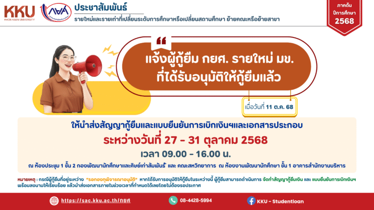กยศ. (รายใหม่) แจ้งผู้กู้ยืมให้จัดทำและนำส่งเอกสารสัญญากู้ยืม,แบบยืนยันการเบิกเงินฯ พร้อมด้วยเอกสารประกอบ18 กันยายน 202518 กันยายน 2025